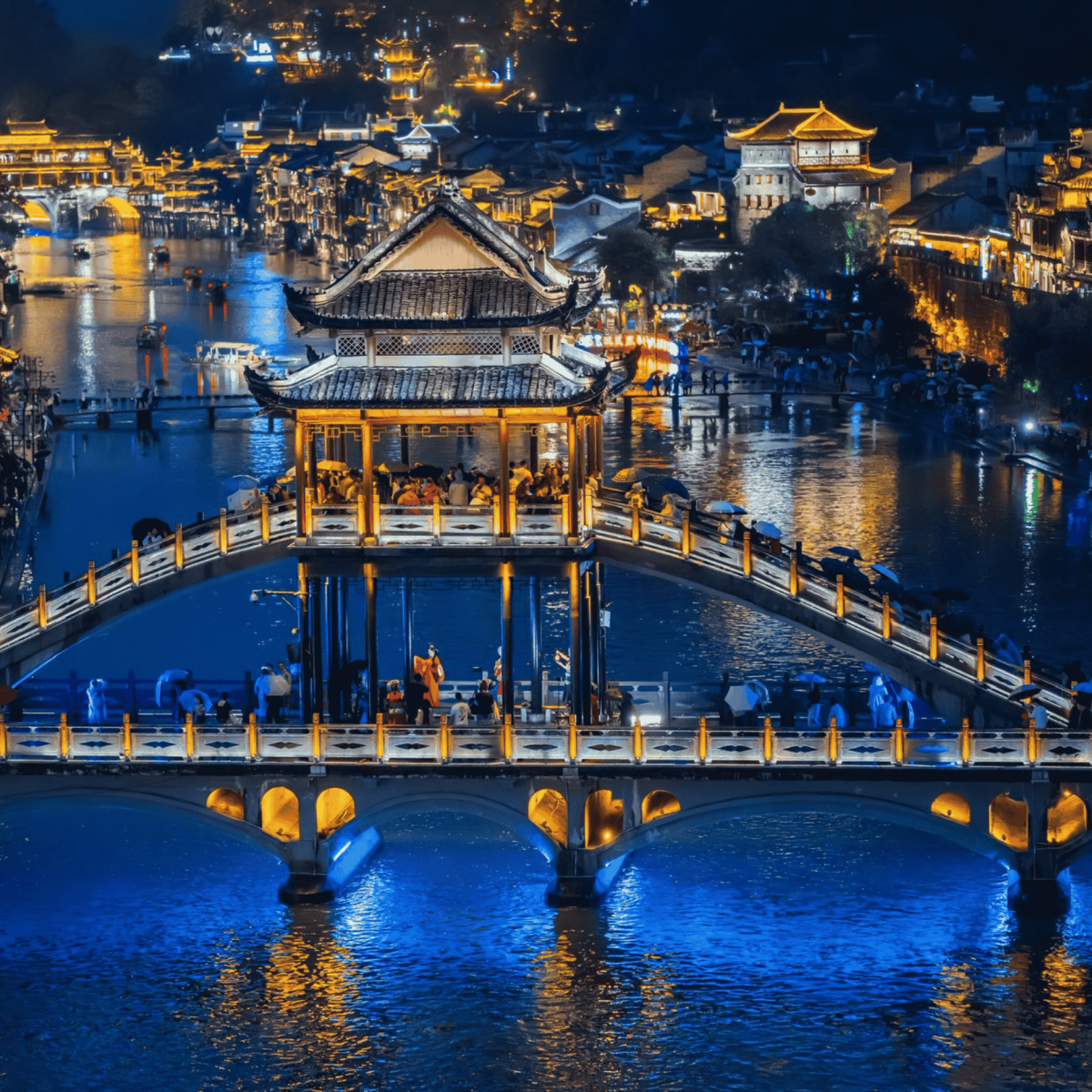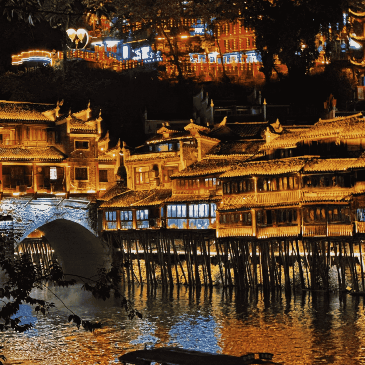 Phượng Hoàng về đêm đẹp theo một cách rất khác, đầy lung linh và vô cùng huyền bí, những kiến trúc cổ được thắp sáng bởi những ánh đèn màu ấm in hình lên dòng sông Đà Giang đẹp như một bức họa màu nước của người họa sĩ; Quý khách sẽ tham quan và khám phá Phượng Hoàng Cổ Trấn với Tháp Vạn Danh, lầu Miêu Miêu, Bắc Môn cổ thành, Lầu phong Thúy Hồng Kiều…